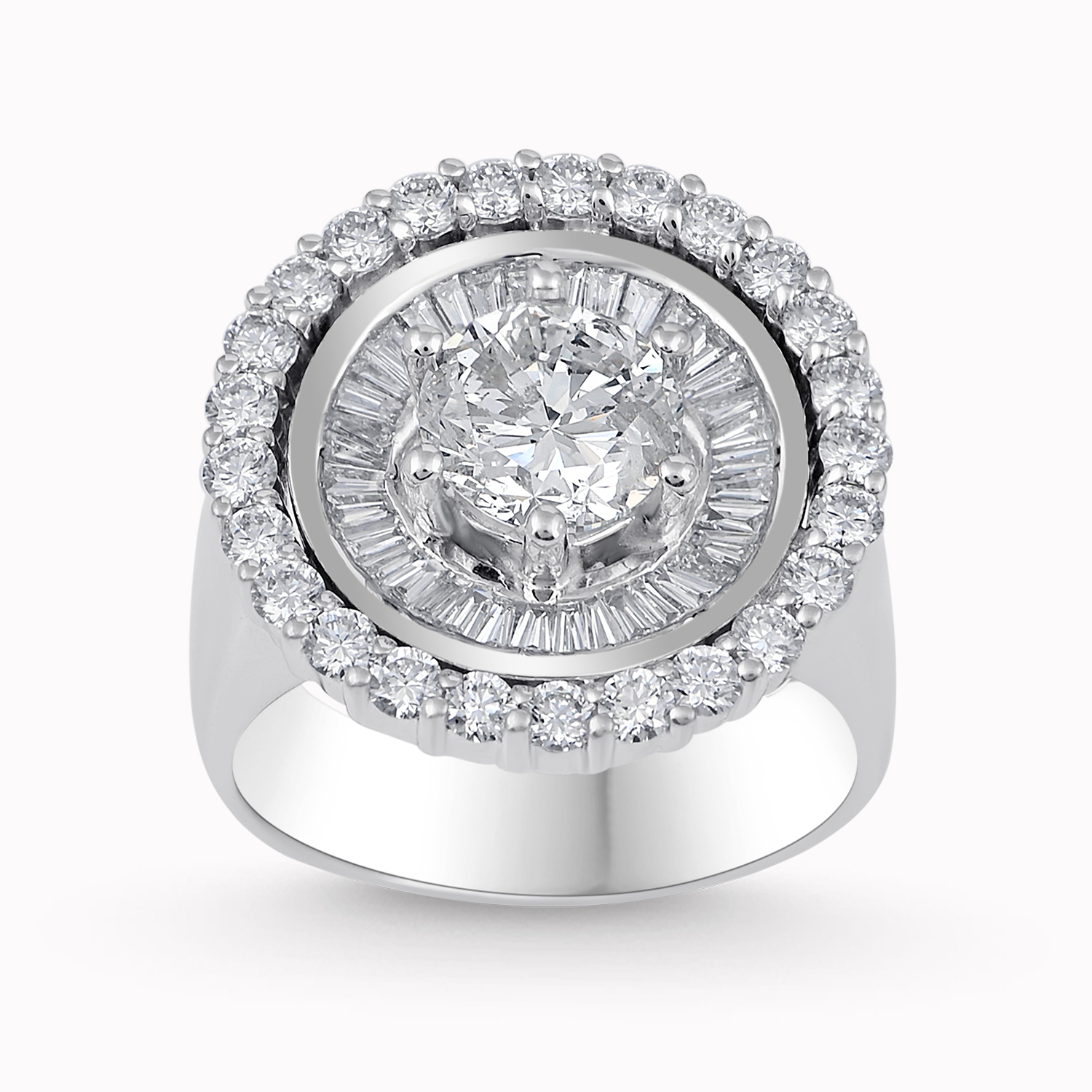 Eternal, alluring, and versatile; the piece is handcrafted in an 18karat gold ring set to the center with a 1.50carat round brilliant cut solitaire diamond. paired with a baguette and round diamonds.