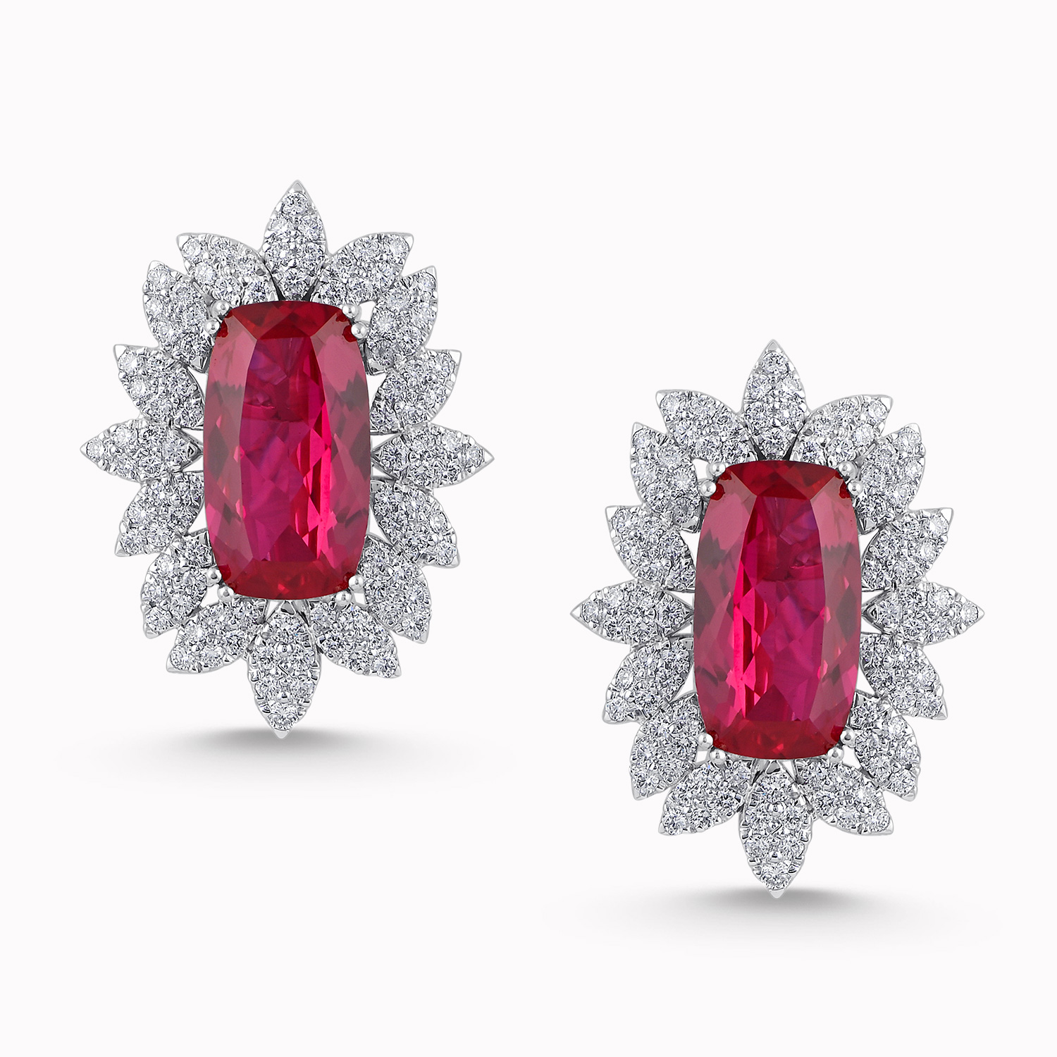 Centering a cushion-shaped ruby, surrounded by marquise shapes filled with round diamond earrings.