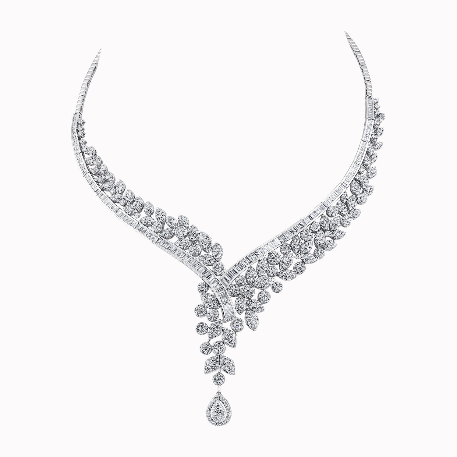 Featuring an art deco style with scrolling designs and a draped knot, set with round and baguette diamonds.